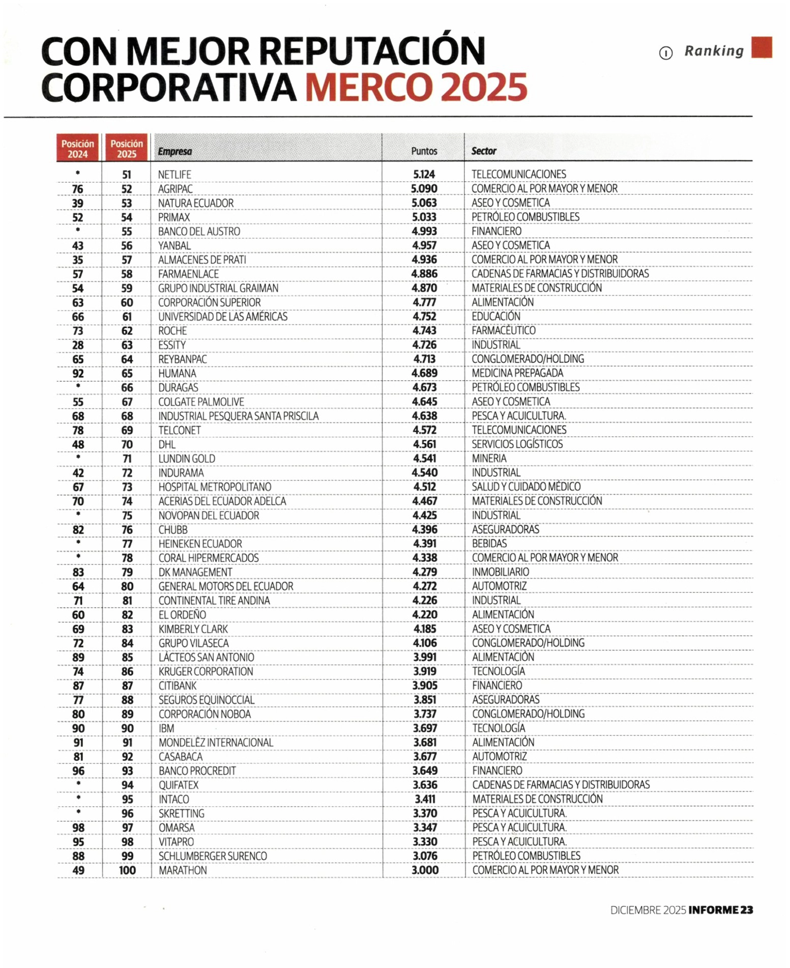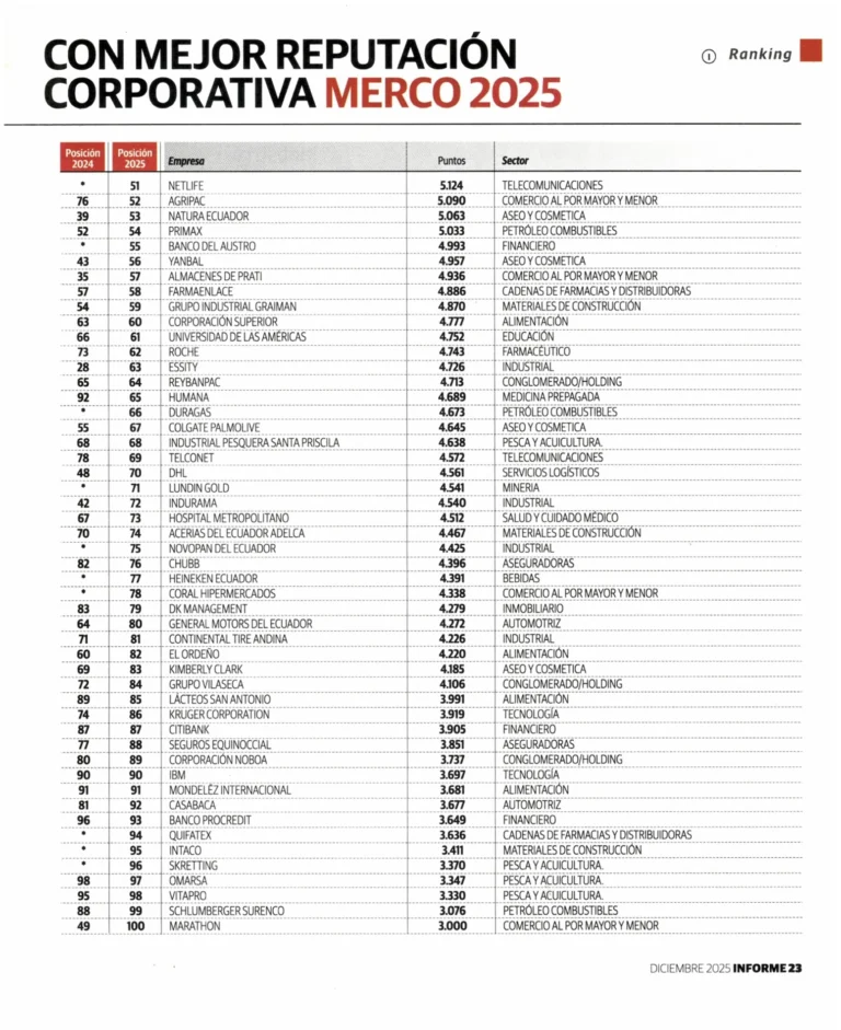 En el ranking de reputación de las 100 mejores empresas evaluadas por MERCO, nuestra empresa dio un paso muy importante al pasar del puesto 76 al 52, logrando una mejora de 24 posiciones.